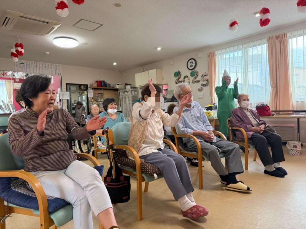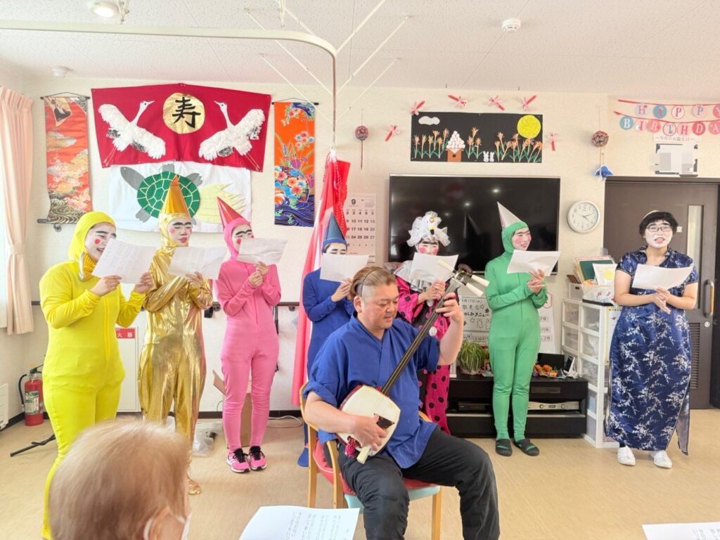 フーミーでは3日間にわたり敬老会を行いました。お寿司食べ放題から始まり、職員の余興では皆様お腹をかかえて大笑い!三味線でしっかり締めてとても賑やかな敬老会となりました。